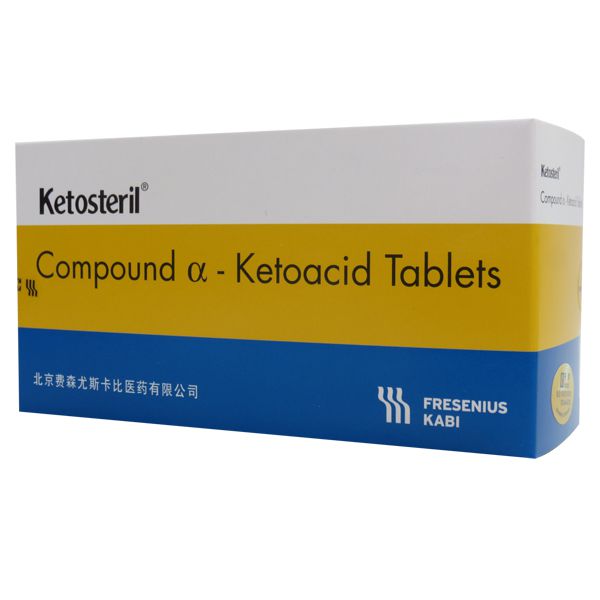 【成  份】每片含有 :DL-3-甲基-2-氧-戊酸(DL-异亮氨酸的α-酮-衍生物)钙盐67 mg,4-甲基-2-氧-戊酸(亮氨酸的α-酮-衍生物)钙盐101 mg,2-氧基-3苯基-丙酸