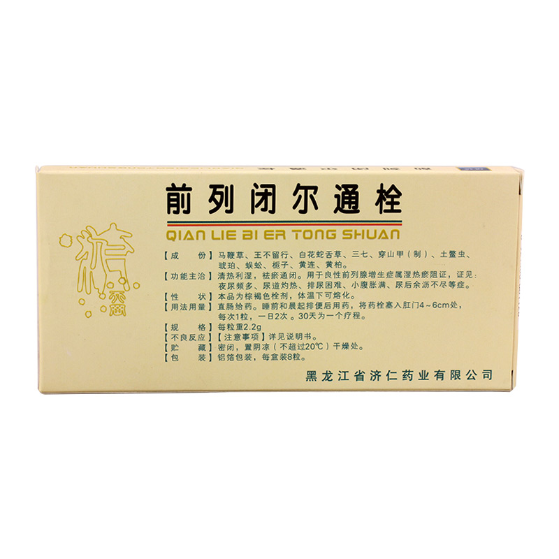 【适  应 症】清热利湿,祛瘀通闭。前列闭尔通栓用于良性前列腺增生症属湿热瘀阻证,证见:夜尿频多、尿道灼热、排尿困难、小腹胀满、尿后余沥不尽等症。