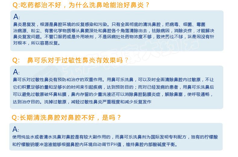 请仔细阅读说明书或在医务人员的指导下购买和使用。 【产品名称】 鼻可乐鼻腔清洗器 【规 格】 240ml+3.5g*10袋 (器+洗鼻剂10袋)【产品特点】 1.双正压反回流专利技术 2.不回流,不呛水 3.全面清洗鼻腔鼻窦 4.发明专利配方洗鼻剂 5.简单、安全、轻松、舒适 【适用范围】 1.用于鼻腔、鼻腔分泌物结痂清洗 2.萎缩性鼻炎药物清洗 3.鼻咽(癌)术后和化疗冲洗 4.清洗鼻部粘膜,避免因粘液在鼻腔的阻塞而导致感染,保护鼻腔粘膜 5.职业性吸入粉尘的鼻腔保健冲洗 【组 成】 1个洗鼻器 、10袋洗鼻剂 【使用方法】 1.加洁净的温水 2.加入洗鼻剂,水平移动摇匀 3.洗鼻 【批准文号】苏食药监械(准)字2011第2641167号 【生产厂家】 江苏泰德医药有限公司 |